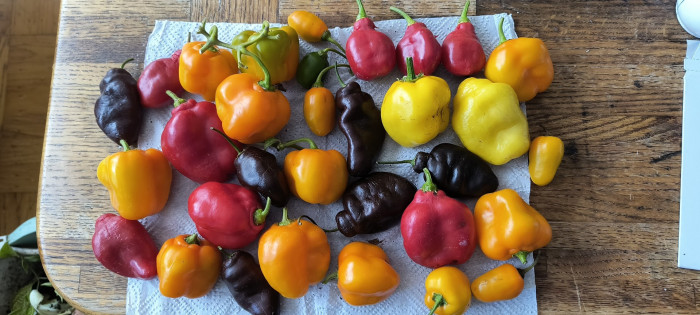 Siete variedades de chile rocoto/manzano (Capsicum pubescens) en un paquete mixto de 24 semillas. Se ofrecen de 3 a 5 semillas de cada uno de los siguientes: rojo grande, naranja grande, marrón chocolate, rojo lágrima, amarillo gigante, tejón de miel y lágrima amarilla, todo en un solo paquete. La especie pertenece al género Capsicum (pimiento), conocido como rocoto. Originario de los bosques nubosos de América Central y del Sur. Debido a su evolución en los bosques nubosos, crece y prospera en climas fríos. (Estos son algunos de los únicos tipos de chiles que crecen en niebla fría, como la que se encuentra en el Área de la Bahía de California). El nombre de la especie, pubescens, significa peludo, lo que se refiere a las hojas peludas de este chile. Los chiles tienen semillas negras. Son perennes y viven durante años. Son muy picantes y deliciosos, con paredes gruesas, y son ideales para comer frescos en guisos, sopas, salsas o salsas, y para secar. Son excelentes frescos para salteados, huevos, guisos y cualquier otra cosa que combine bien con chiles frescos. Sus hermosos y vibrantes colores los convierten en una excelente adición a su jardín. Son extremadamente ornamentales. Alcanzan hasta 2 metros de altura si se dejan crecer durante varios años en una zona con heladas ligeras o nulas. Se venden en paquetes individuales, así como en varias combinaciones mixtas, y próximamente tendremos más variedades. Consulte todas las variedades en Constant Gardener.
